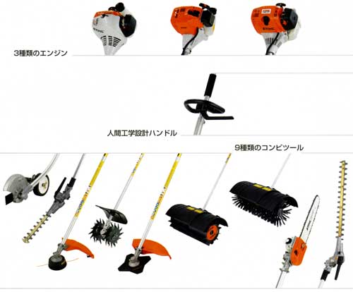コンビシステムの用途 お客様のニーズに最適なエンジンとハンドルの選択後は、コンビツールをお選びください。 9種類のコンビツールは、幅広い用途の作業を可能にします。 もちろんコンビツールを買い足すことも可能です。 お客様の作業条件に合わせて、様々な作業に柔軟に対応するこのシステムを利用して、コンビツ-ルを徐々にお取り揃えいただけます。 |