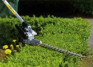 ◆HL-KMヘッジトリマー、FH-KMグランドヘッジャー 広範囲の生け垣をカットするアタッチメント(HL-KM) 小石を飛び散らすことがなく、安全に草を刈るアタッチメント。 公園など人が近くにいる場所での作業に最適です。 写真は、グランドヘッジャー(FH-KM)です。 |